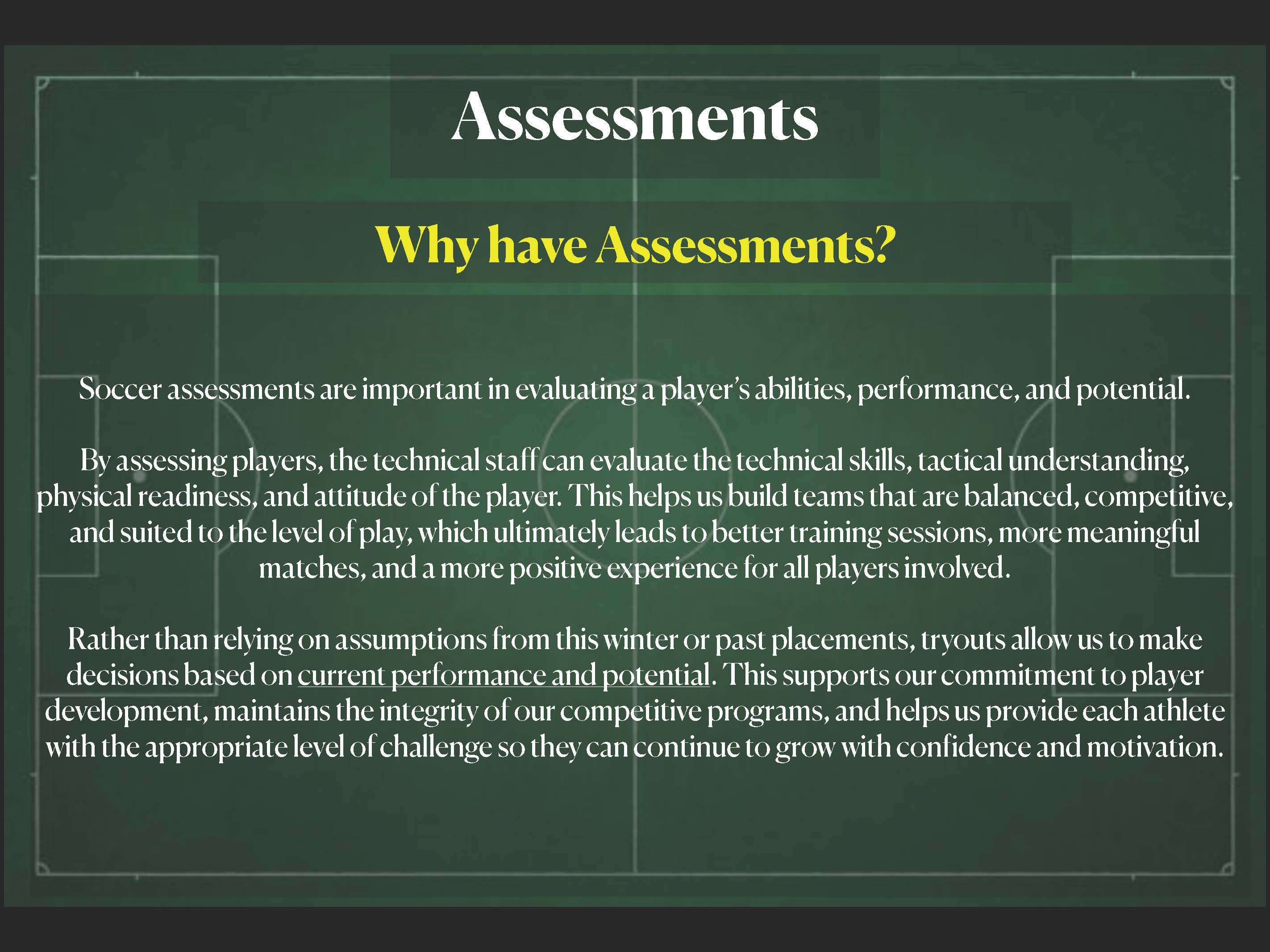 All players must attend all assessment dates so coaches can get a full picture of each athlete’s readiness for the season.
