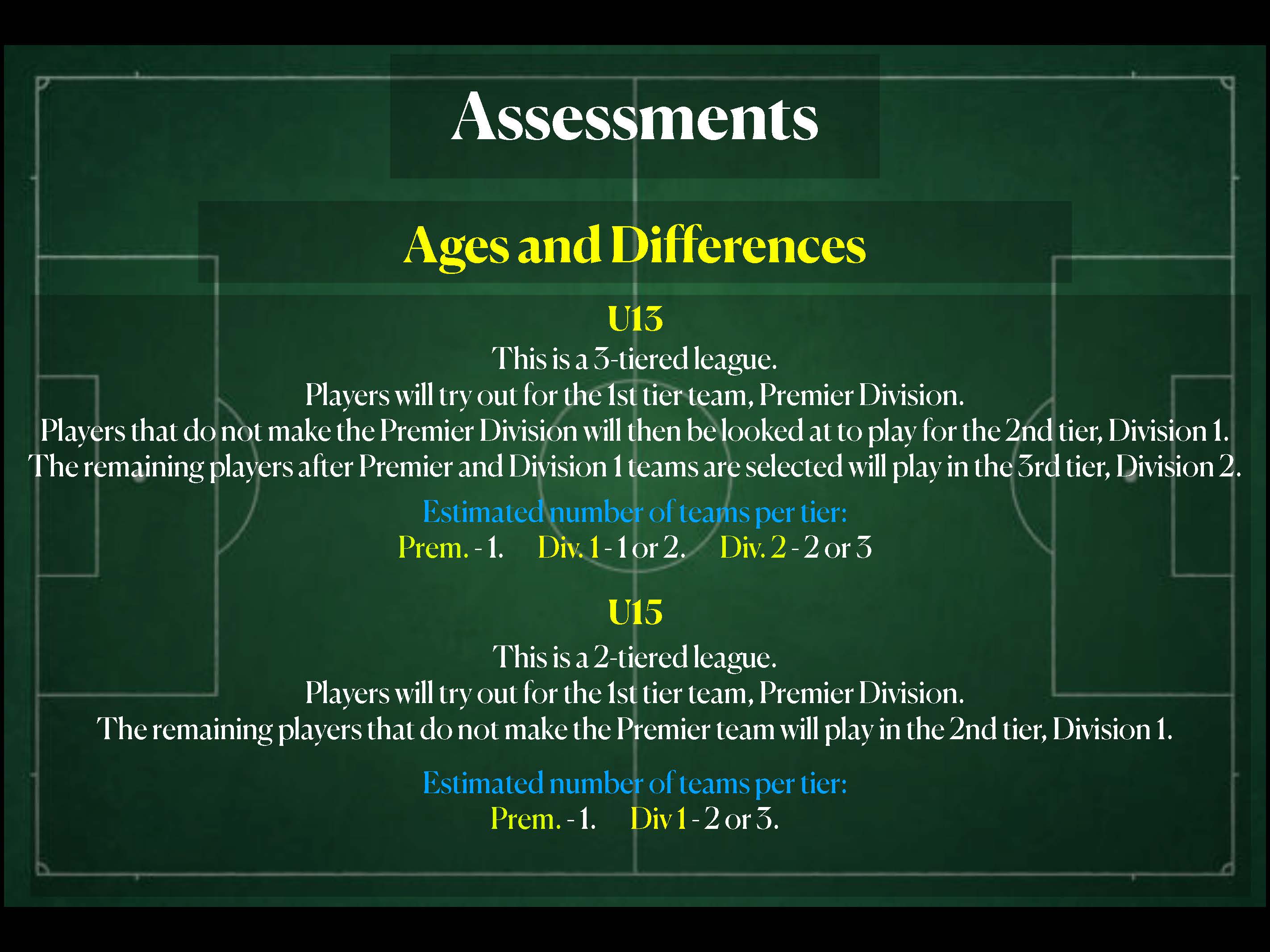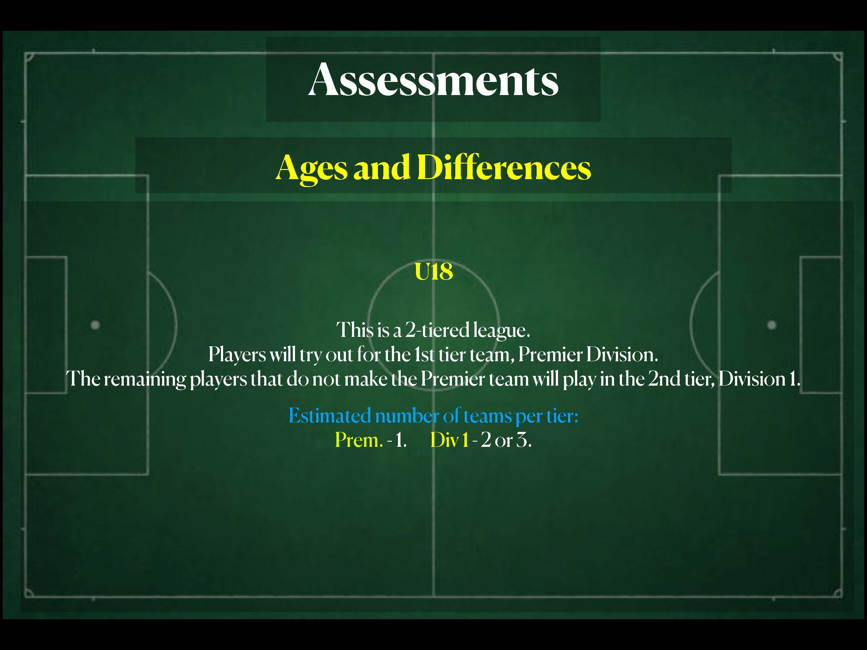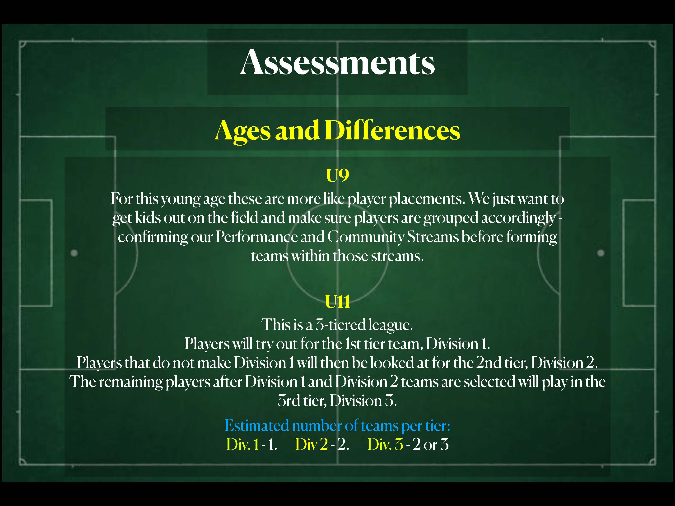 - All other players will be placed on First Division or Second Division based on assessments.