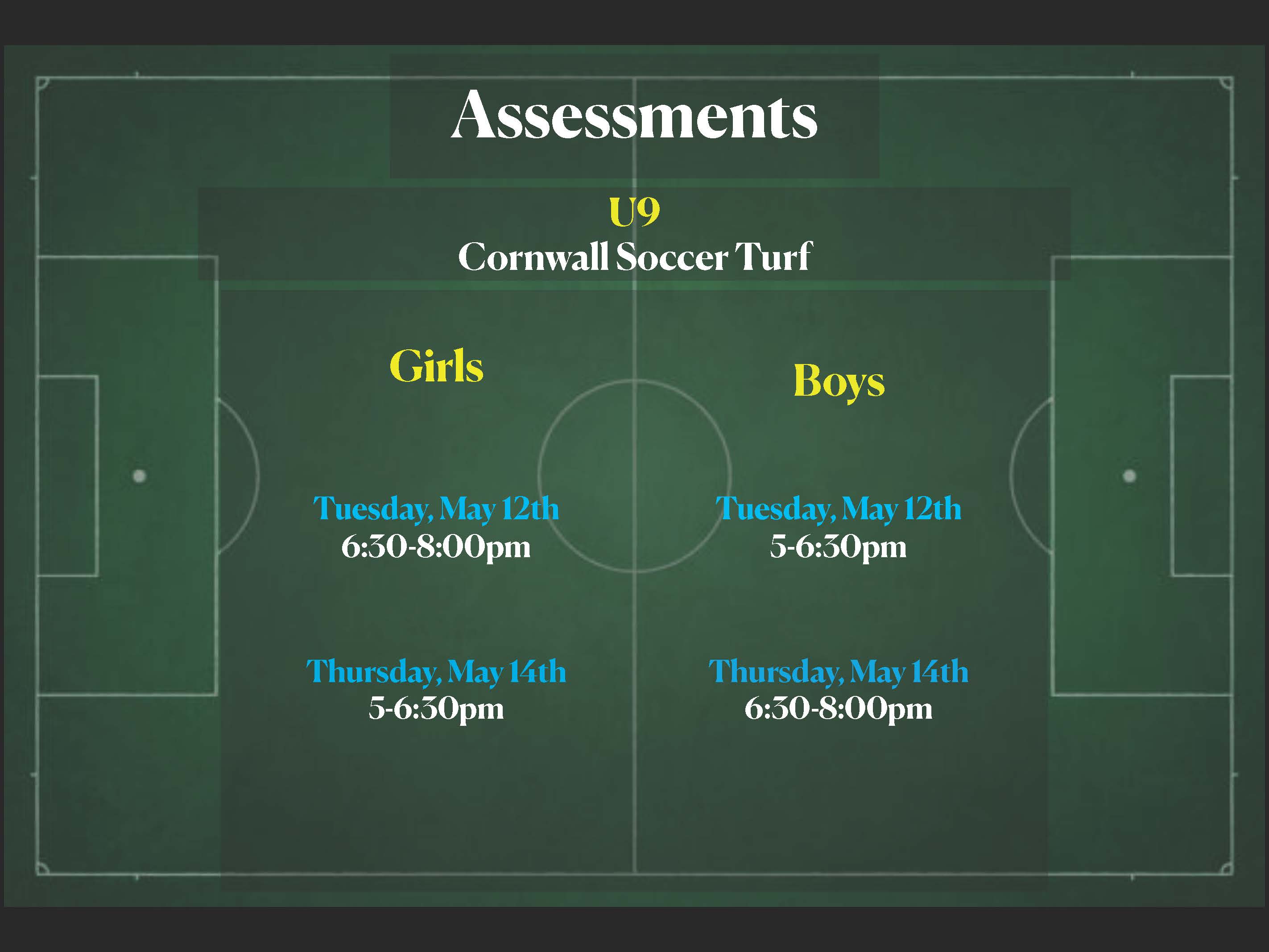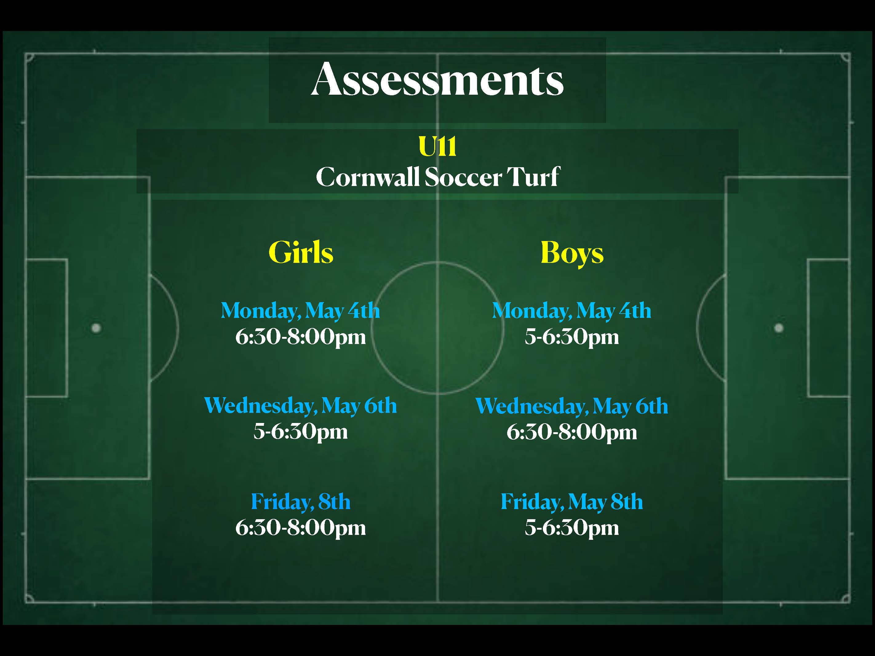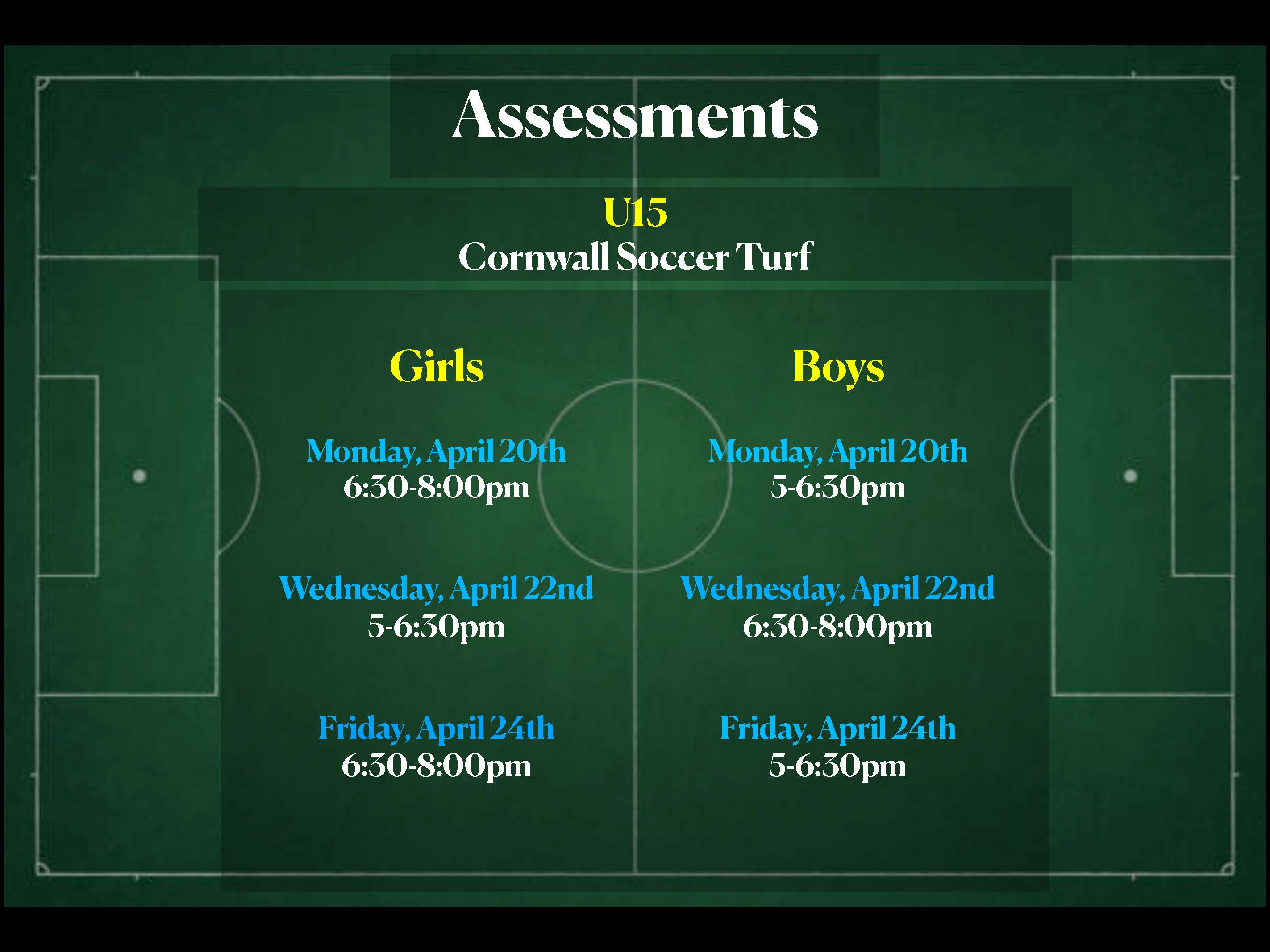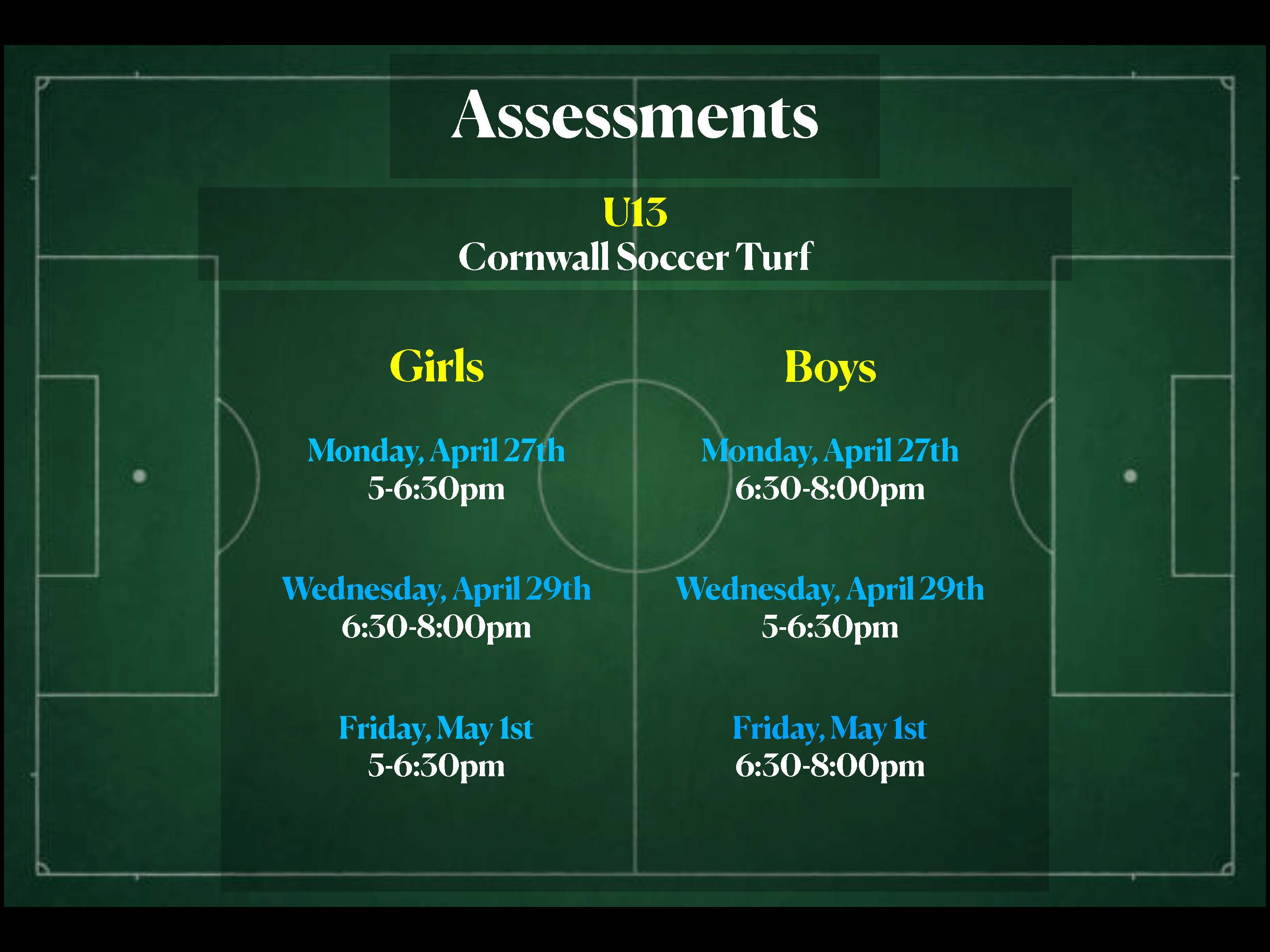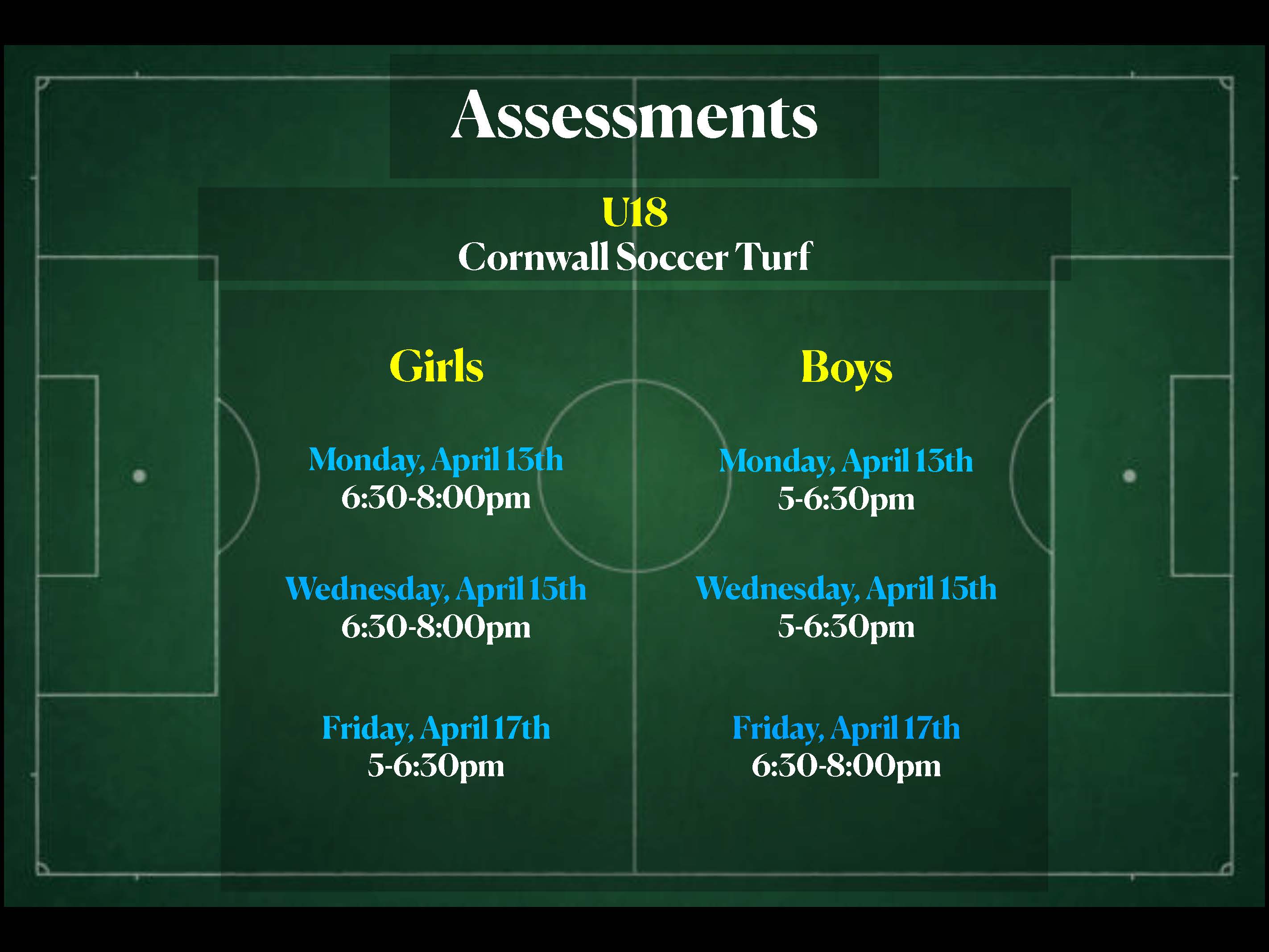 - Location: All sessions take place on the Cornwall soccer turf, please dress for the weather and field conditions.